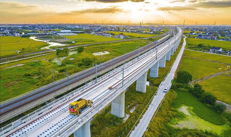 近期,南京枢纽指挥部精心组织、周密部署,会同参建单位全力开展南沿江城际铁路轨道铺设,确保工期按期优质有序推进。图为10月18日,铺轨车在太仓市沙溪镇境内铺设钢轨。