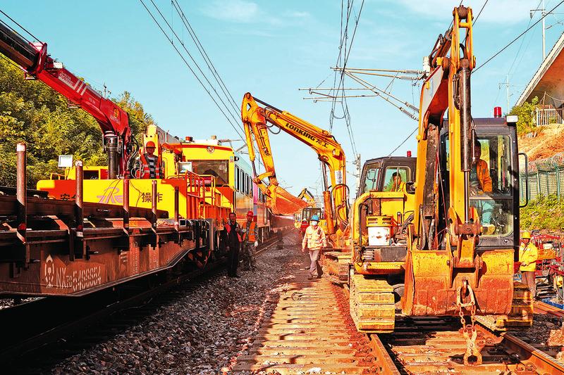 在京沪线第二阶段集中修中,南京桥工段运用“兵团作战”模式,根据施工项目科学调配各车间进行联合施工,挖掘机、捣固机、吊装组等齐上阵,开展大机和小机群相结合养修作业,提高了集中修效率。图为该段作业人员在进行道岔大修、旧钢轨回收作业。