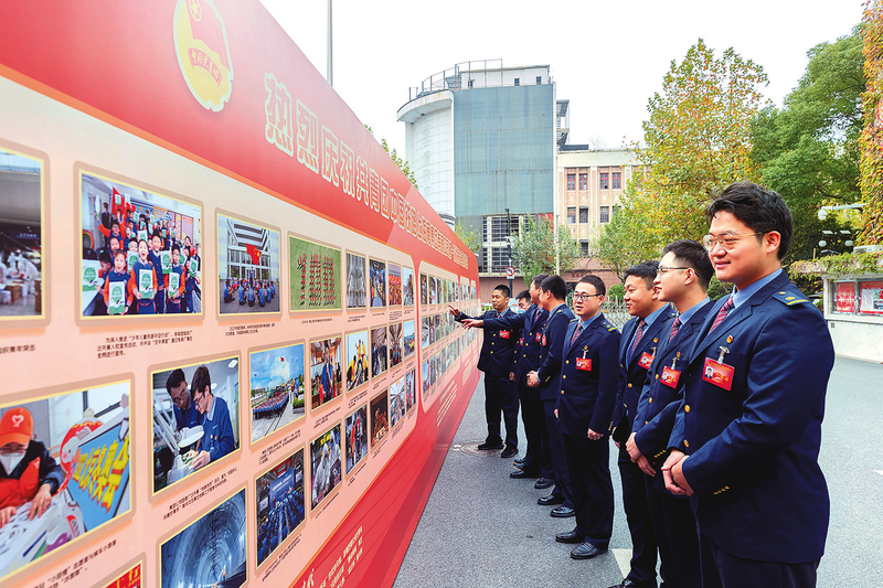 集团公司第一次团代会期间,集团公司团委制作长三角铁路青年奋斗图片展板,通过一张张珍贵的历史照片,追溯上铁青年在党的领导下,积极投身长三角铁路建设、改革、发展的奋斗之路,展现一代代上铁青年的风采。图为参加此次团代会的上海主会场代表在集团公司机关大院观看图片展。