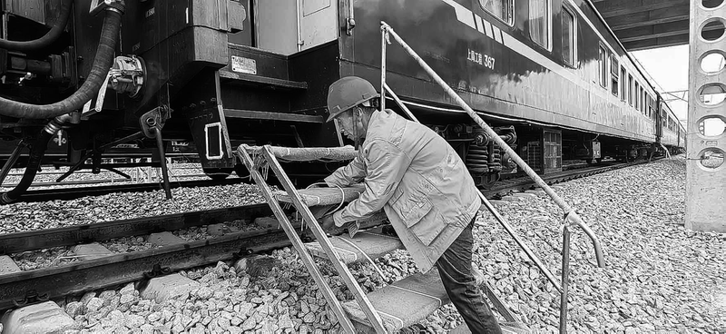 近期,上海大机检修段通过强化劳动安全教育和加强设备检查整治等多种方式积极做好防寒过冬工作,确保职工冬季劳动安全。图为该段职工在给宿营车阶梯包扎防滑麻袋。