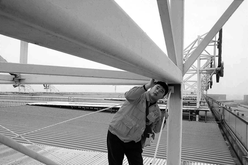 为做好冬季安全生产工作,确保房建设备安全运行,上海房建公寓段成立专项检查小组,对管内房建设备开展专项检查活动。图为该段专项检查小组成员叶正茂在检查上海虹桥站的站牌钢结构。