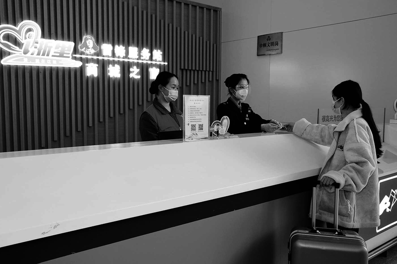 金华车务段义乌站“i浙里·商城之窗”雷锋服务站工作人员热情解答旅客问询。 何栋 摄