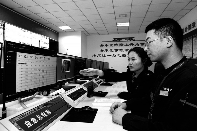 客运部积极推进客站一体化管理改革,实现站区深度融合、高效联动、提质提效。图为合肥站合肥南客运车间综控员与驻站申铁杰能公司员工,核对每日站区网格化系统巡检等情况。 刘勇 摄
