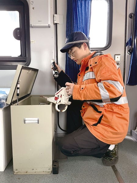 轨道车司机正在检查铁鞋柜内铁鞋的编号及数量