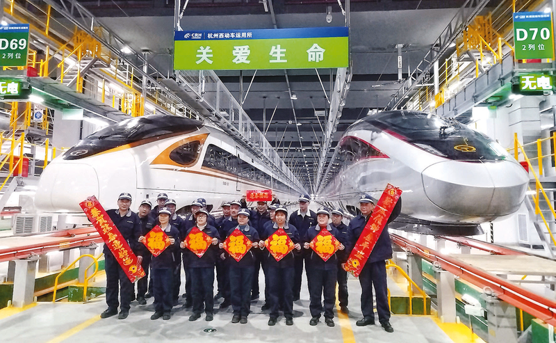 2023年春节将至,为营造浓厚的喜迎新年氛围,集团公司所属各单位广泛组织开展新春游艺、写春联送福字、特色团圆饭等活动。图为上铁机辆公司职工在杭州西动车运用所内手拿福字和春联向大家拜年。