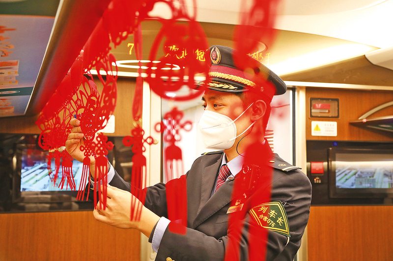 为了让旅客在途中感受浓浓年味,合肥客运段G9480次列车乘务员正在悬挂中国结,精心装扮车厢。