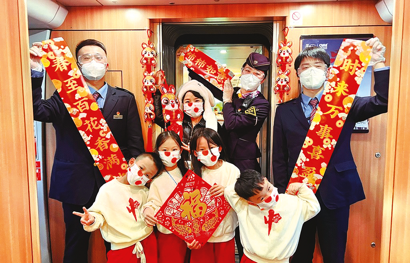 新春佳节临近,在北京开往上海虹桥的G17次列车上,兄弟姐妹4人身着红色套装,跟妈妈去上海游玩,上海客运段高铁一车队列车乘务员向他们送上对联、挂件,一起喜迎兔年到来。