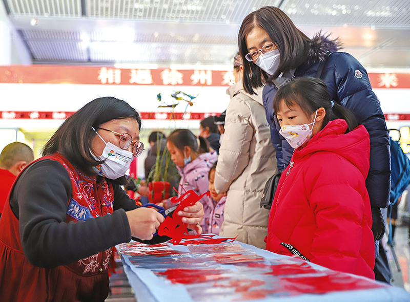 1月18日上午,徐州站组织民俗艺人,在徐州东站候车大厅举行“民俗中国年 顺心回家路”活动,民俗艺人们在活动现场进行皮影戏表演和糖画、面塑制作,为旅客们送上民俗礼物。