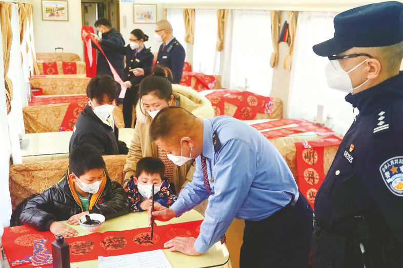 “不羡富贵常相伴,但求健康永同行。”“畅游学海到彼岸,勇攀书山达顶峰。”一副副寓意美好的春联,在许如山的笔下产生,不时博得围观职工的夸赞。许如山在餐车里笔走龙蛇、行云流水,一个小时不到,就书写春联、“福”字20余份。“我来选两个‘福’字,两副春联!”广播员司茜看着笔迹未干的春联,脸上露出幸福的笑容,不住地赞赏,“以前过年的春联是花钱买的,这次是我们身边的书法家写的,感觉就是不一样。”