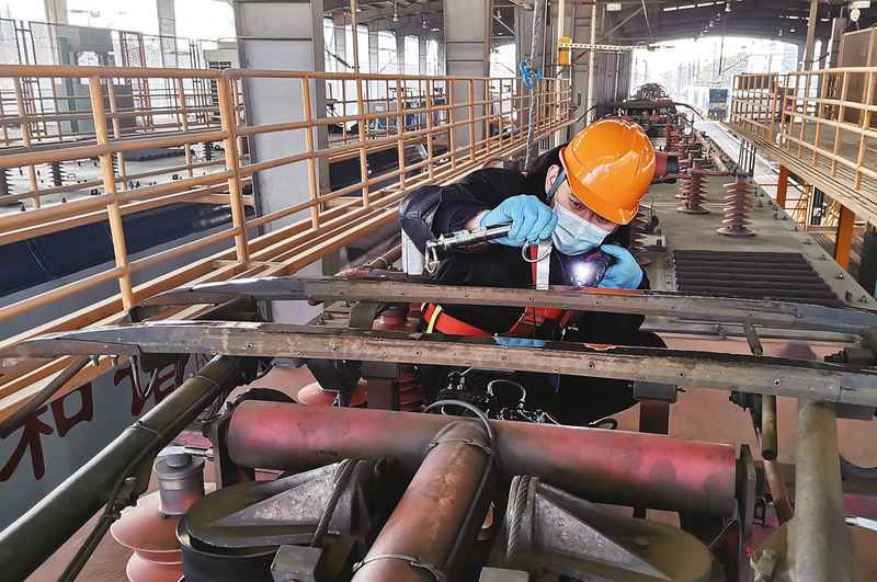 图③:1 月22 日,杭州机辆段乔整车间职工在库内检测电力机车车顶、受电弓,保证车顶高压设备安全。 (通讯员 范国坚 摄)