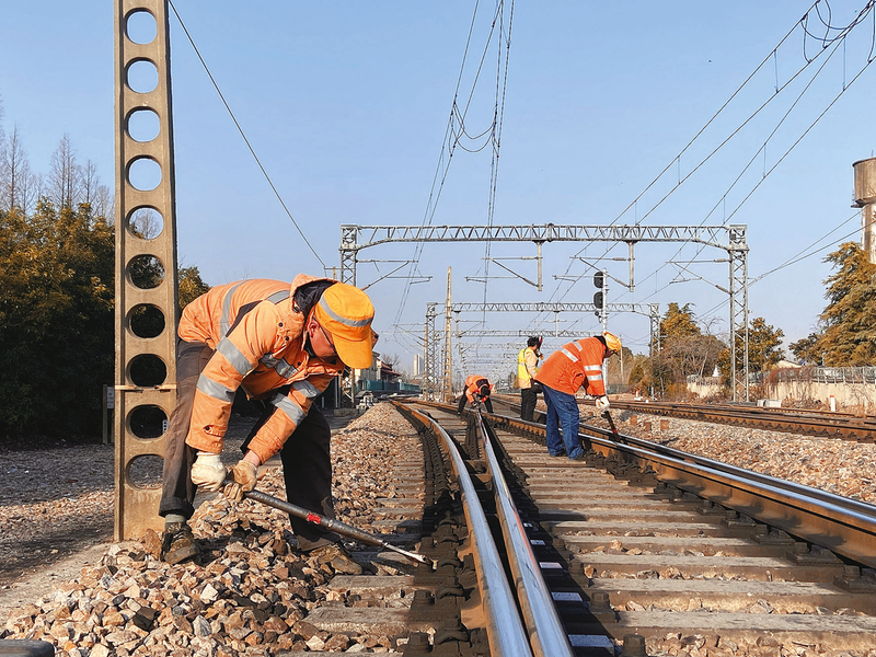 图①:1 月21 日,南京桥工段南京北线路车间职工在东葛站,进行道岔巡查、螺栓复紧和岔心预防性打磨作业。 (通讯员 张翔宇 摄)