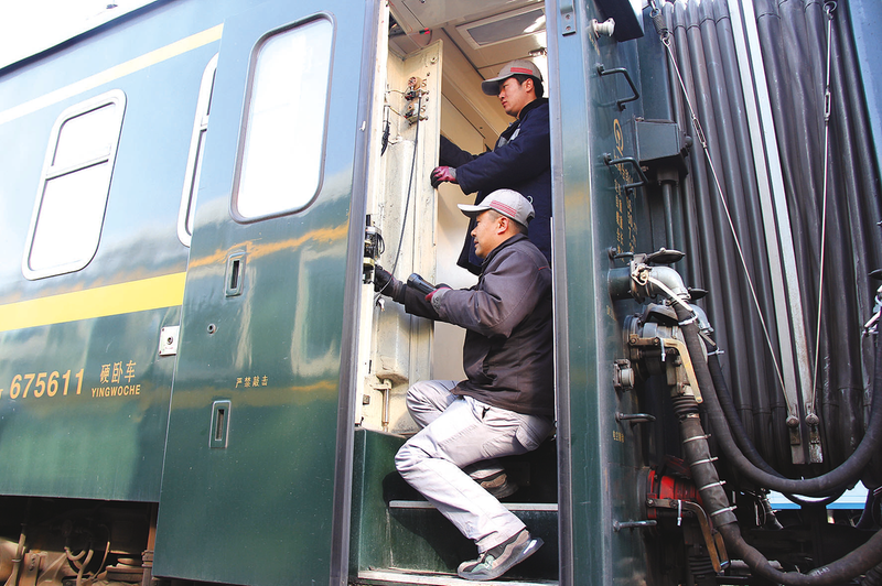 图②:1 月21 日,合肥车辆段合肥运用车间专项修班组职工在检修列车塞拉门。 (通讯员 吴小强 摄)