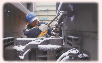 25013次货物列车携一身寒气在9道稳稳停下,作为前部作业队长的金新光向司机询问列车途中运行情况,然后摘解机车,挥锤传递作业号志,认真插设安全防护,逐辆精心检查修理,联系组织制动机试验……没过多久,被冻得僵硬的手脚渐渐活动开来。只见他不断进出车下查看,俯身弯腰探头,手拉灯照锤敲,不时用对讲机向列检值班员报告,动作规范,紧张有序。