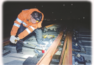 检查完转辙区段,裴宁继续检查胶结绝缘接头。因钢轨在冬季出现的冷缩现象会导致接头拉开,所以,每一次检查都要测量两轨端的直线距离,确保实测不超限。导曲部位是道岔检查工作的重点项目,必须用检查锤敲击每一个朝天螺栓,通过声音判断螺栓是否存在松动问题。