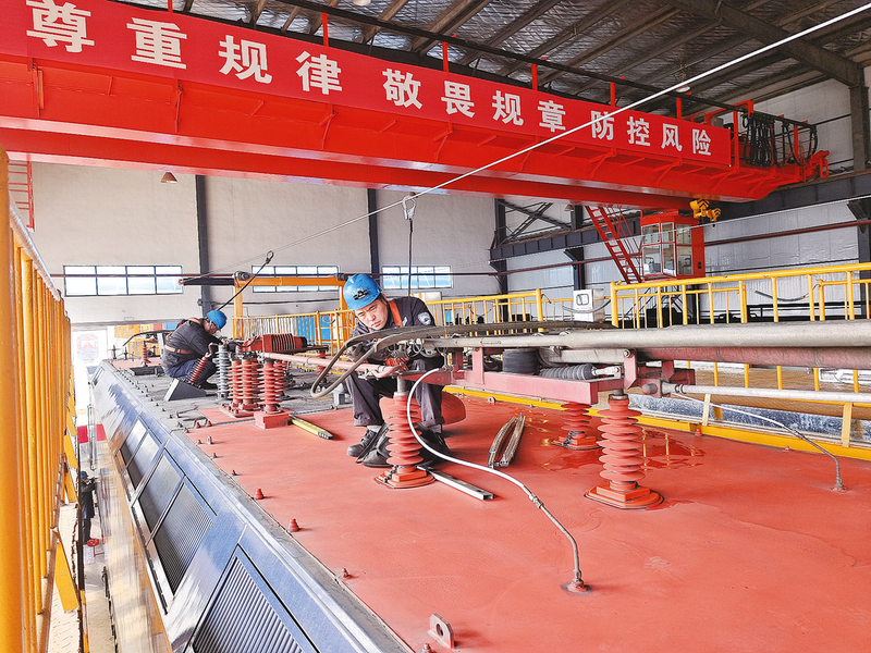 合肥机务段按机型分别整治一台机车作为“样板车”,以“样板车”为标准,精心开展“样板车”整治,推动机车春鉴春整工作全面开展。图为该段职工在机车顶部更换机车受电弓滑板。 (通讯员 王道强 摄)
