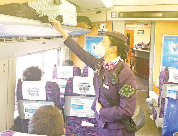 图为阮文静巡视车厢时整理行李架。(通讯员 于盈盈 摄) 实习记者 宋亚堃 通讯员 魏影