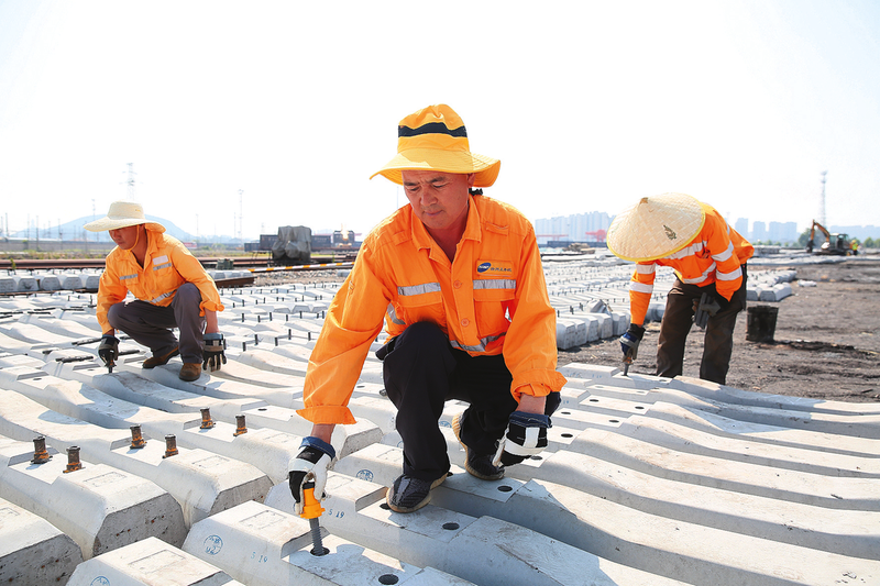 图①:该段职工在利用螺旋道钉定位器紧固道钉。 (通讯员 王琼泽 摄)