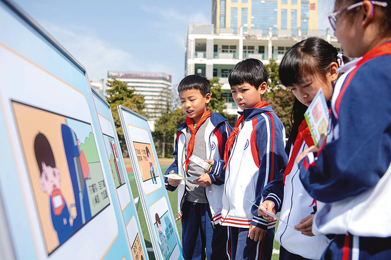 乔司站绘制的安全咨询日漫画吸引学生观看。 王凯磊 摄