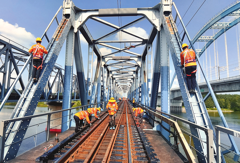 近期,徐州工务段、徐州电务段、徐州供电段组织技术力量,突出桥梁外挂电缆、桥面轨枕、接触网、轨道电路及设备基础箱盒等关键轨旁设备,开展联合作业,对防洪安全隐患进行再排查再整治。图为三家单位作业人员联合对陇海铁路上行线邳州运河铁路桥进行检修养护。