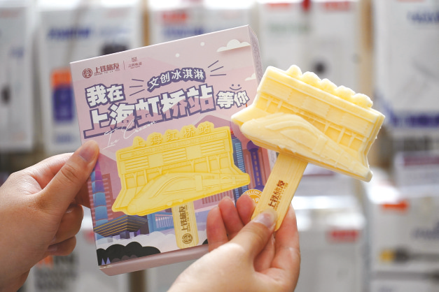 图②:“我在上海虹桥站等你”文创冰淇淋。(通讯员 杨阳 摄) 本报讯(通讯员 毛佳浩)“这款冰淇淋味道不错,造型也别致,很有铁路特色呢!”8月24日,在上海虹桥站候车大厅内,几位带着小孩出行的旅客在旅友书屋门店前品尝“我在上海虹桥站等你”文创冰淇淋后,赞不绝口。