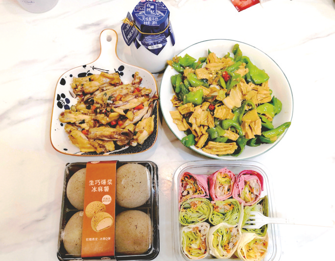 紧接着,我将事先准备好的蔬菜鸡肉寿司、爆浆冰麻薯和老酸奶从微波炉和冰箱中取出,作为今天的主食和饮品。色彩斑斓的鸡肉蔬菜寿司,和一口爆浆的冰麻薯令人满口生津,蒜香鸡翅的回味和青椒腐竹的鲜美让我齿颊留香。