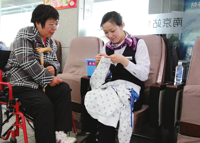 “158”雷锋服务站客运值班员黄吉莉为旅客缝补衣服。 段利雷/文 王庆庆 孔令震/供图