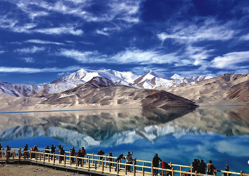 喀拉库勒湖是仰望雪山的最好地方,被称为中国“冰山之父”的慕士塔格峰近在眼前。湖面蜿蜒曲折,伸向湖水的栈道依势而建,漫步栈道,千年雪山一意孤行,始终不离左右。因雪山太多太近,喀拉库勒湖云气水气较重,有时从雪山飘过来的厚厚云层几乎可以遮盖大半个湖面,而云朵聚散间露出的天空便成为我们头顶上蓝晶晶的天窗。