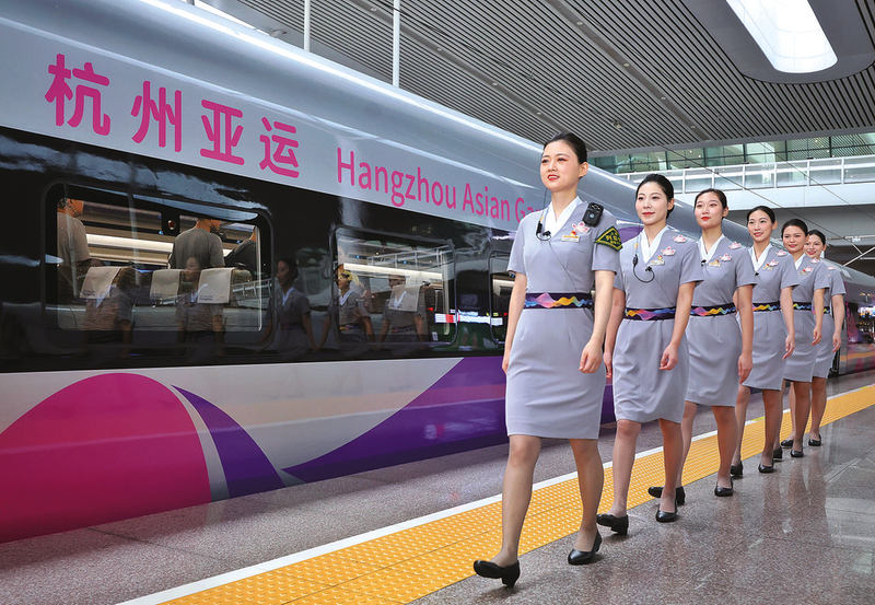 记者注意到,亚运列车运营当天,为亚运列车专班乘务员量身定制的全新制服也正式亮相。新服装主色调为灰色,领口搭配亚运会吉祥物和白玉兰花配饰,腰带设计理念来自杭州亚运会核心图形“润泽”,体现出“温润万方、泽被天下”的气韵与胸襟。