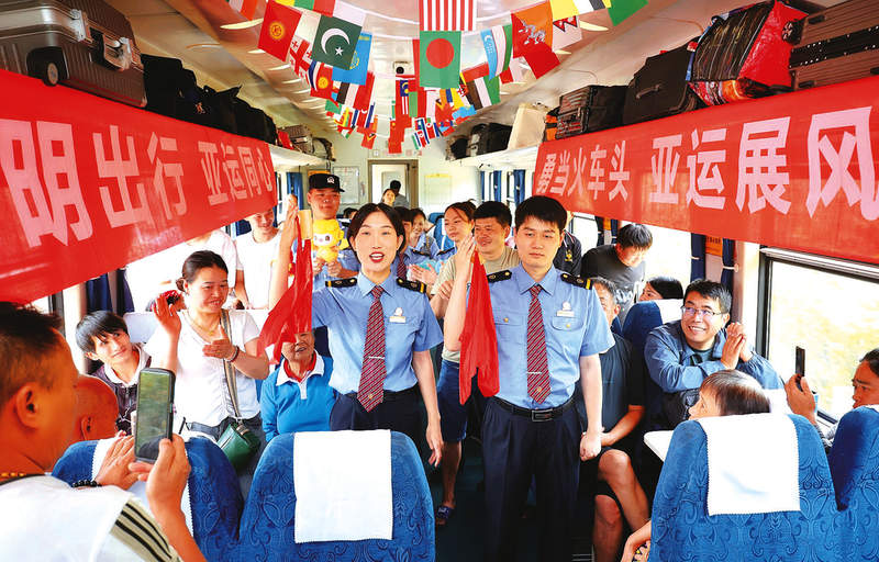 本报讯(通讯员 陈美芳)“打竹板,啪啪响,杭州亚运听我讲……”9月13日,清脆的快板声在广州开往宁波的K210次列车上响起(见图:周围/摄影)。这是杭州客运段陈美芳劳模工作室团队成员开展的“文明出行·亚运同行”主题活动,通过亚运知识竞猜、亚运礼仪现场教学、亚运快板节目等活动,让迎亚运氛围充斥整个车厢。