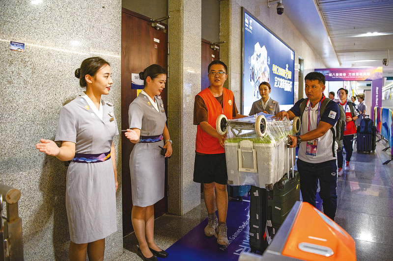 图④:金华车务段职工和志愿者引导亚运会运动员出站。(通讯员 胡肖飞 摄)