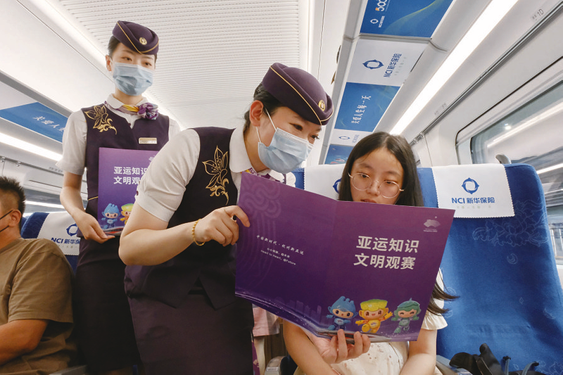 图①:上海客运段乘务员为旅客讲解《亚运宣传手册》。(通讯员 王叶波 摄)