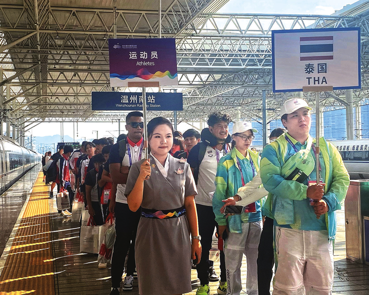 图⑤:宁波车务段客运专班工作人员做好亚运会运动员出站引导。(通讯员 张文青 摄)