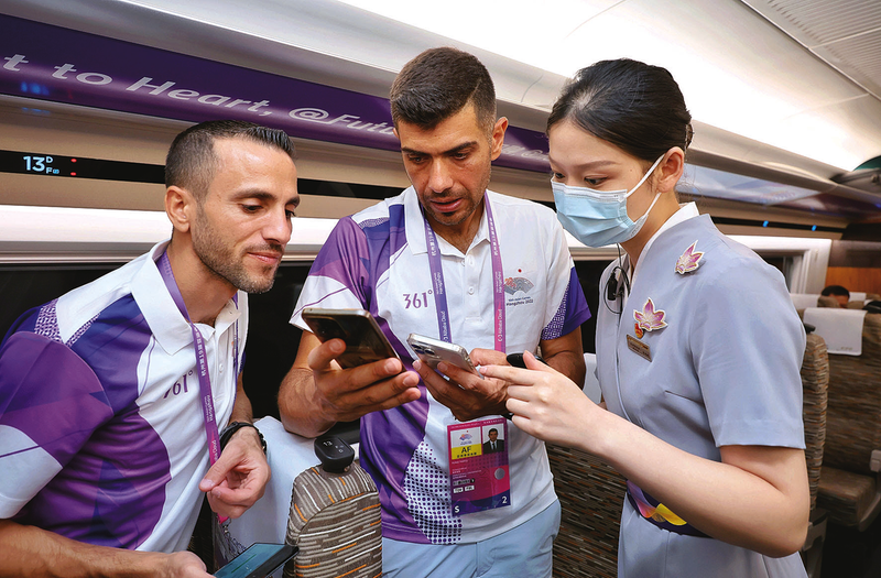图③:杭州客运段乘务员为亚运会运动员讲解乘车知识。(通讯员 周围 摄)