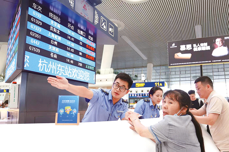 图②:杭州东站候车大厅工作人员为旅客解答乘车问题。(通讯员 汤鑫严 摄)