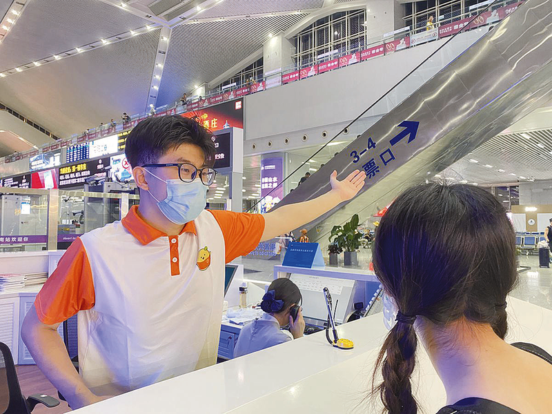 专项培训结束后,“小甜橙”们被分配到车站各个岗位,为旅客提供问询解答、票务咨询、重点帮助、文明导乘等志愿服务。橙色的身影出现在12306服务台、进出站口、售票处等服务岗点,成为温州南站一道最亮丽的风景。秦子强被分配在12306服务台,自9月20日志愿服务工作开展以来,车站的客流量每天都很高,问询量也很大,好在岗前培训的基础知识他牢记心间,能得心应手、灵活应对。