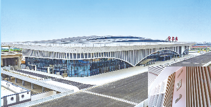 句容站站房建筑面积14904平方米,站场规模2台6线。句容以道家“第一福地、第八洞天”茅山和“律宗第一名山”宝华山闻名于世。站房外立面设计以“道法自然、生态句容”为理念,屋面采用三层叠级设计,犹如层层波纹映照句容山水。站房建筑屋面中部高起,两侧悬挑突出,描绘出茅山古建筑的飞檐形态;立面以玻璃幕墙、穿孔板进行组合,虚实相映的立面形象寓意中国传统文化中“阴阳相合”理念。“福”文化是该站主要文化元素,以当地元代青花的五福祥瑞云水纹进行拆解组合,通过蚀刻、镂空雕刻和夹胶印花的方式,将其嵌入站房柱体、地面、吊顶、玻璃标识之中。