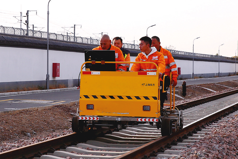 12时30分,“天窗”命令下达,张思雨带领作业人员上道作业。上线联控、搬卸零件、组装调试仪器……几名探伤工有条不紊地操作着,大约15分钟,一辆可以乘坐4人的“双轨探伤小车”就已拼装、调试完毕。主驾驶是机械操作员,负责操纵小车以不超过每小时15公里的速度在钢轨上匀速前行;副驾上坐着的是探伤检测员,他要集中注意力,时刻紧盯电脑屏幕,从探轮实时反馈的波形图中甄别出异常波形,一旦发现可疑波形,需要及时复核校对;后排则坐着作业负责人和现场防护员,对作业进度及安全进行总体把控和认真防护(见图)。“以前,我们使用的是手推‘单轨探伤仪’,人员长时间徒步行走容易疲劳。现在使用‘双轨探伤小车’,作业效率是从前的4倍,还能同时对两根线路进行检测。”张思雨介绍。