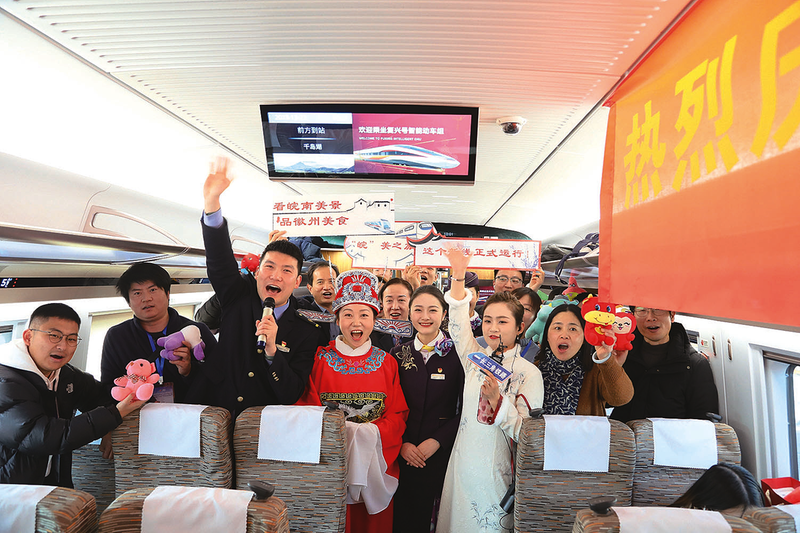 列车穿行在桥隧间,车厢内平稳而舒适。“为救李郎离家园,谁料皇榜中状元……”4号车厢,老家安庆的合肥客运段乘务人员程金霞在众人围观中,表演黄梅戏《女驸马》。每个车窗贴着徽派建筑和黄山风景窗花,车厢在“看皖南美景、品徽州美食”“欢迎杭昌高铁黄昌段开通运营”等红色横幅装饰点缀下,喜气洋洋。歌咏、舞蹈、知识问答等活动一个接着一个。