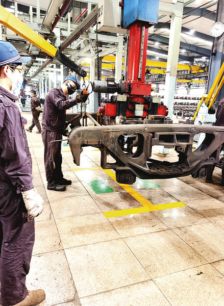 “这是绿色安全区,那是黄色警戒区……”班组长韩俊开始为大家解惑。原来,这是一个预防安全隐患的新举措。车间在之前的“守底线、补缺陷、除隐患、防风险”安全专项整治行动中发现,转向架线上班组装作业岗位的个别职工为了“赶”生产节奏,存在一个边移动吊挂小车边作业的坏习惯。这让工长韩俊很是替弟兄们捏了一把冷汗。