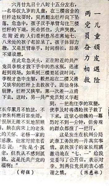 1987年7月初某天,我段一名顽皮少年翻出三楼栏杆,悬挂在空中,两名党员职工冒着生命危险,站在滑溜溜的二楼栏杆上救了他。时值段党委开展庆祝建党66周年活动,被救少年母亲写了一封感谢信,张贴在段机关大门口。