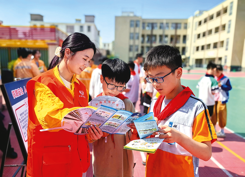 “5·26我爱路”主题宣传教育活动启动以来,集团公司及所属各单位围绕活动主题,广泛开展形式多样、内容丰富的爱路护路主题宣传教育活动,凝聚强大合力,共筑平安铁路。图为合肥电务段职工在阜阳市周棚小学开展爱路护路宣传教育活动。