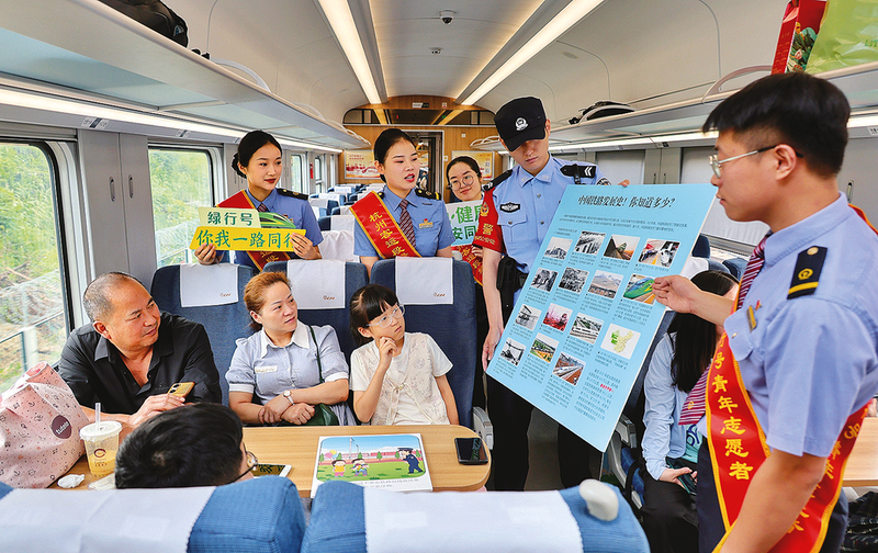 图④:杭州客运段杭京车队联合杭州铁路公安处乘警支队在C403次列车上向旅客讲解铁路安全知识。 (通讯员 周围 摄)