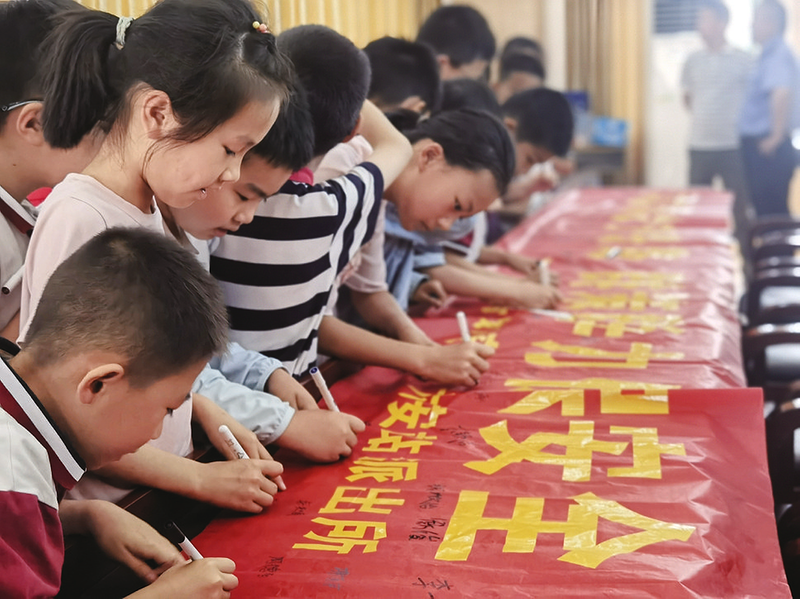 图⑤:六安市人民路小学学生听完合肥车务段六安站职工安全宣讲后,进行签名承诺。 (通讯员 李颖洁 摄)