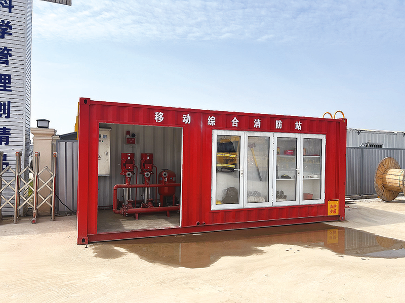 移动综合消防站以集装箱结构为单元,采用工厂预加工、现场拼装方式完成组装,包含变频消防自动恒压给水设备、储水箱、消防器材柜、储沙箱等功能模块。消防站个头虽小却“五脏俱全”,灭火设备一个不落,可拆卸的结构能够根据施工进度“哪里需要去哪里”,满足施工现场消防工作各项要求,是具有一体化、智能化和可重复使用功能的新型移动消防站。而且占地少、成本低、搭建周期短,在提高工地抵御火灾能力的同时,降低消防成本投入。
