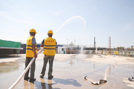 图②:现场工作人员使用消防设备。 本报讯(通讯员 丁广东 文/摄)依托“小快灵”模块化消防站,密织“3分钟灭火救援圈”。日前,上铁建工雷威公司在芜湖塔桥北路下穿宁芜铁路立交工程工地,正式启用移动综合消防站,以实现“抵近防范、救早灭小”目标。这是集团公司首次投用集装箱式移动综合消防站。