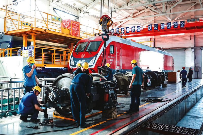 徐州机务段检修车间走行组、电力组等班组联合作业,提高机车“足部”免疫力,确保汛期机车安全。图为更换牵引电机作业。