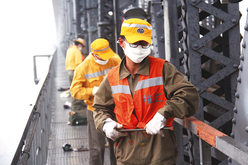 进行大桥栏杆除锈刷油漆作业 (谭浩 摄)