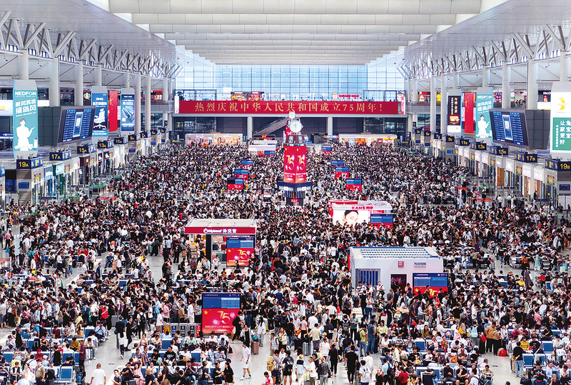 针对国庆黄金周期间客流持续高位,上海直属站开设“一窗通办”窗口,为需要办理多项售票业务的旅客提供退票、改签、重新购票“一站式”服务,同时加强与站区管委会、地铁、公交等部门的沟通联系,通过加开班次,延长运营时间,做好到达旅客的疏散。10月1日,该直属站发送旅客672814人,创单日客发量新高。图为上海虹桥站候车大厅。