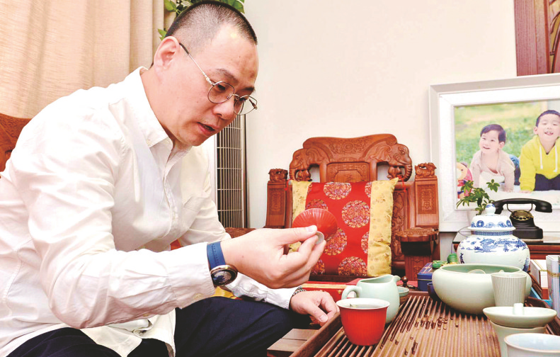 “我国是茶的故乡,有着漫长的种茶、制茶和饮茶的历史文化,蕴藏着国人谦、和、礼、敬的价值观。”董滨爱茶,不论上班,还是在家休闲,他常备一杯热茶,既是解渴消烦,也是在赏茶、品茶,探究传统茶文化的乐趣。在他的客厅内,楠竹茶盘、雅致的杯壶和各具特色的名茶,无不散发出浓郁的古风气息,使人不知不觉进入传统文化的美妙境界。