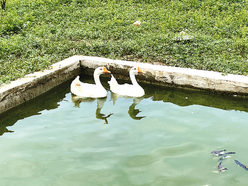 院落很大,春夏季,草地杂草疯长,除草的工作量巨大。徐保明积极向车间、段工会申请,购买了3只羊、30只鸡、2只鹅。科学规划,自给自力建设了小菜园、桃园、葡萄园。池塘内也是鱼群嬉戏、荷风迎笑。